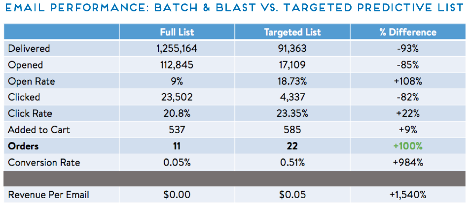 The first, targeted email went to 90k customers, which was one million fewer customers than received the second, batch and blast email, but the first email generated double the orders and 19% more in revenue.